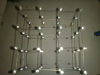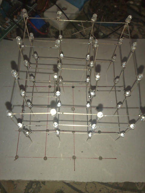 The LED cube is made up from 64 LED's arranged into 4 layers of 16 LED's each. The display itself is multiplexed so instead of requiring 64 connections it requires one to each of the four layers and 16 to each LED in a layer making a total of 20. The cube is refreshed by a software interrupt routine with each layer active for 2 ms so the entire cube is refreshed every 10mS (100Hz). This results in a display with no visible flicker.