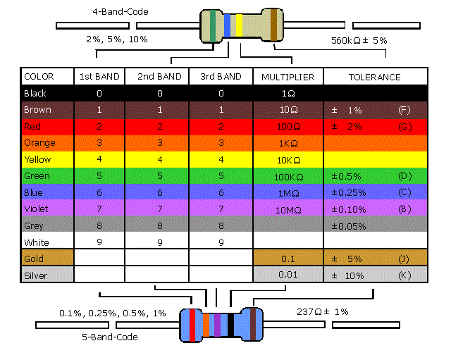 For example, the first resistor shown at the top of this page has a resistance of (47 X 100) = 4700 ohms. The tolerance is plus or minus (10% X 4700) = plus or minus 470 ohms. The second resistor has a resistance of (470 X 1) = 470 ohms. The tolerance is plus or minus (2% X 470) = plus or minus 9.4 ohms.
