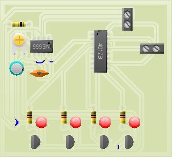 The NE 555 timer ic and decade counter 4017 is the heart of the circuit. The astable multivibrator built around IC2 produces a clock frequency at its output pin 3. This output is connected to clock pin (pin 14) of the decade counter Cd 4017.The decade counter can count up to 10. But in circuit we only use 4 O\P so the Q4 (pin 10) is connected to the reset (pin 15) of the CD 4017. The output of IC3 advances by one count every second (depending on the time period of astable multivibrator IC2). The VR1 connected between the Pins of IC2 determine the speed of the glowing of the bulb.