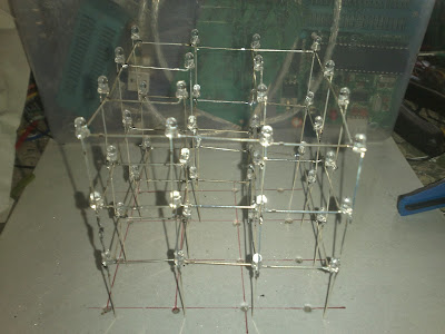 The LED cube is made up from 64 LED's arranged into 4 layers of 16 LED's each. The display itself is multiplexed so instead of requiring 64 connections it requires one to each of the four layers and 16 to each LED in a layer making a total of 20. The cube is refreshed by a software interrupt routine with each layer active for 2 ms so the entire cube is refreshed every 10mS (100Hz). This results in a display with no visible flicker.